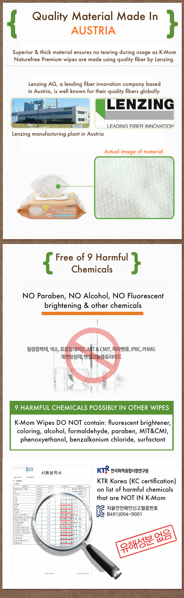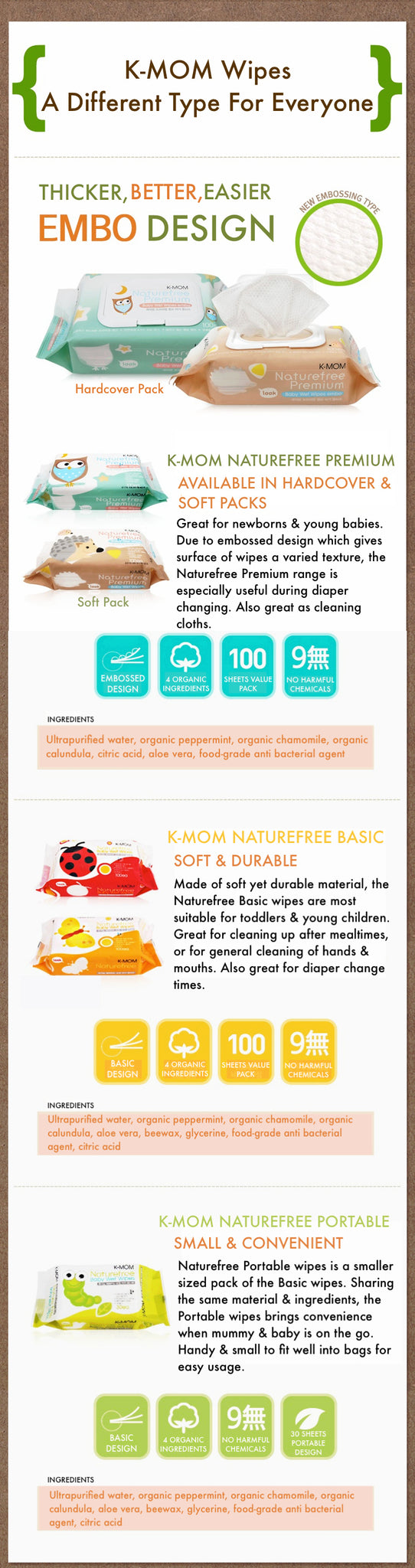 K-Mom's Naturefree Premium Wet Wipes contains 4 natural ingredients & FREE from 9 harmful chemicals! It uses superior material- EMBO, suitable for the baby's delicate skin. Each & every piece of wipe goes through 6 layers of filtration so it is ultra purified!