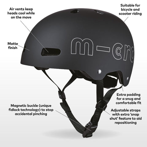 We believe every scooting adventure starts with scooting safely. And we know mini adventurers come in all shapes and sizes. So our lightweight deluxe helmets are packed with the latest technology to ensure even the tiniest riders can enjoy the highest levels of safety. Our featherweight favorite uses state-of-the-art inmould technology to combine light weight with supreme strength. With a magnetic buckle to prevent accidental pinching, integrated rear light for low-light visibility and rear spin dial for the perfect fit. Complete with our worry-free Micro guarantee. Happy heads wear Micro helmets.