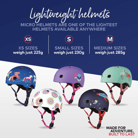 We believe every scooting adventure starts with scooting safely. And we know mini adventurers come in all shapes and sizes. So our lightweight deluxe helmets are packed with the latest technology to ensure even the tiniest riders can enjoy the highest levels of safety. Our featherweight favorite uses state-of-the-art inmould technology to combine light weight with supreme strength. With a magnetic buckle to prevent accidental pinching, integrated rear light for low-light visibility and rear spin dial for the perfect fit. Complete with our worry-free Micro guarantee. Happy heads wear Micro helmets.