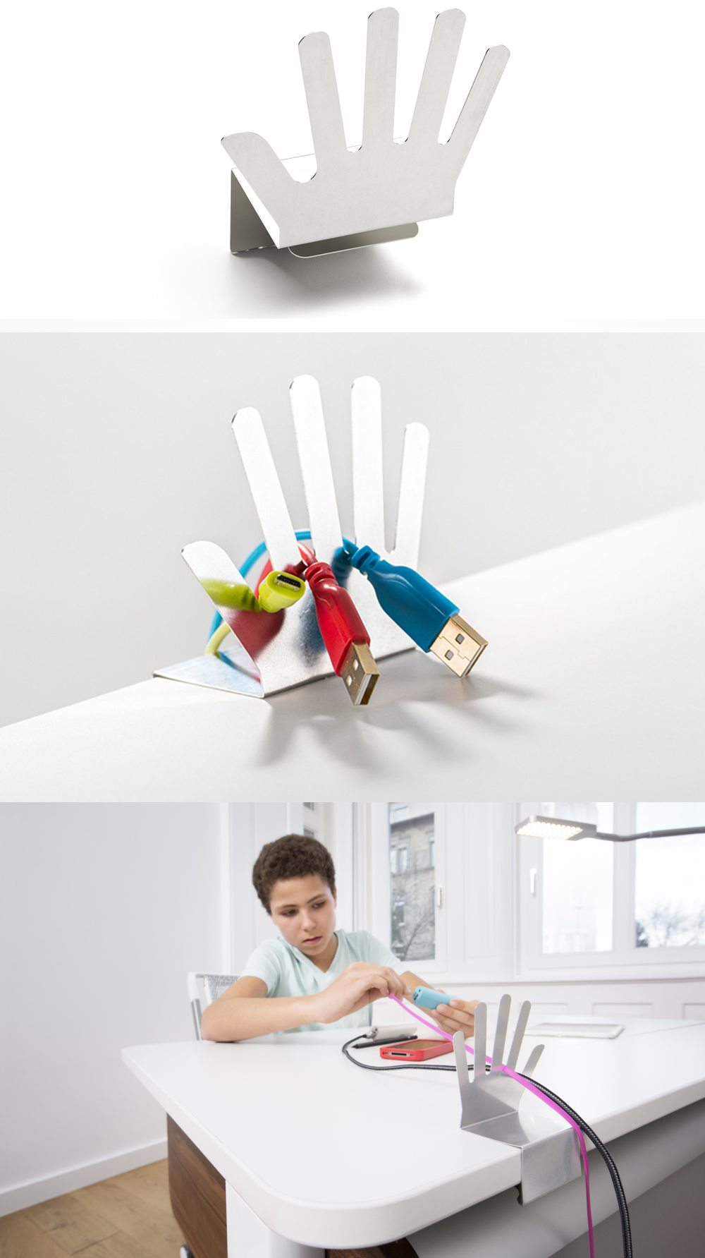The cable butler against the cable tangle on the desk. The Cable Butler is clamped to the desk top and ensures that cable clutter is a thing of the past and creates order on the desk.