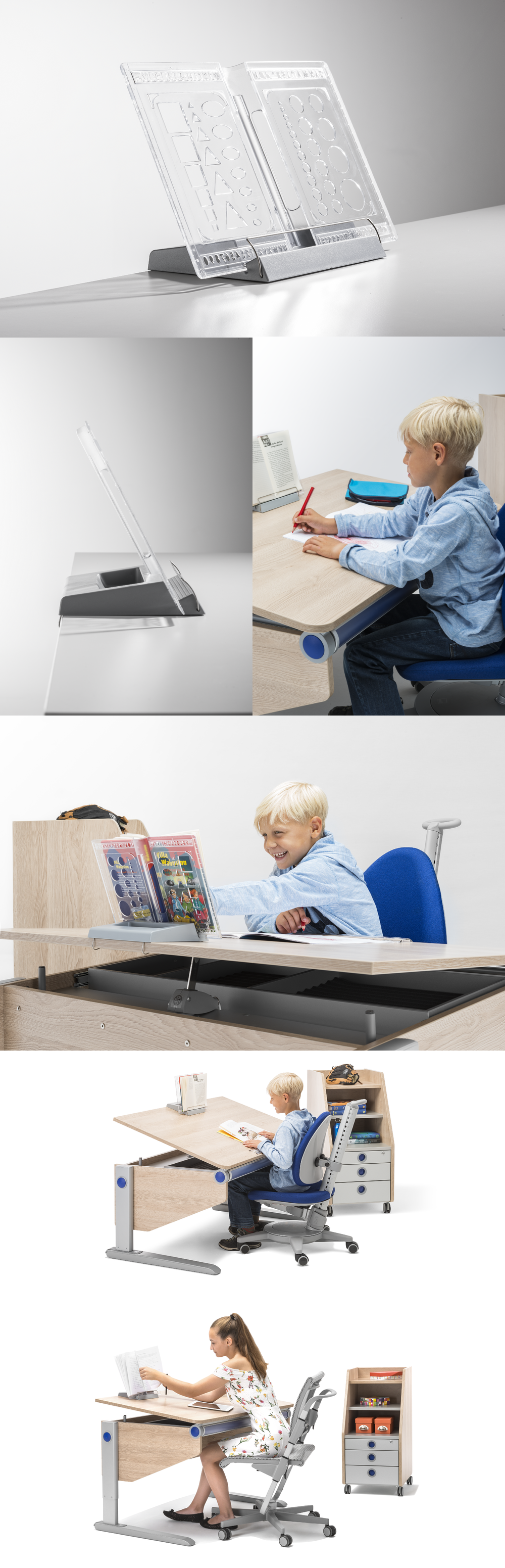 Bookend, timetable holder, ruler, tracing and reading magnifier combined.