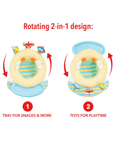 Encourage baby to sit, interact and play with this comfy and supportive seat. The dual-option design lets parents rotate between the handy multipurpose tray (great for snacks!) and three engaging toys depending on baby’s needs. The sturdy, wide-leg base provides stability and the soft fabric seat cover removes for easy machine washing so clean up time's a cinch.